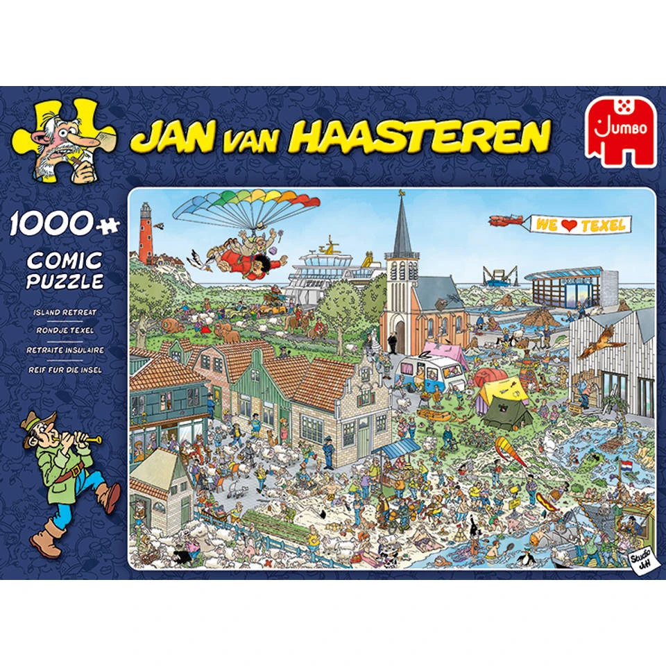 Met deze kleurrijke Jan van Haasteren puzzel van Jumbo heb je ongeëvenaard puzzelplezier. Leg alle 1000 stukjes aan elkaar en ontdek een plaatje van de Texel. Jan van Haasteren puzzels zijn puzzels met veel kleur en details. Jan van Haasteren tekent al decennia lang humoristische platen die je steeds weer verrassen en laten lachen. Kenmerkend voor de Jan van Haasteren tekeningen zijn de terugkerende elementen.