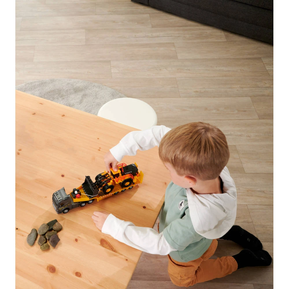 Deze Majorette Volvo truck is perfect voor veilig transport van de wiellader! Op een bouwplaats kun je bijna niet zonder wiellader en om deze te vervoeren gaat er niets boven een Volvo oplegger met veel mogelijkheden. Het perfecte cadeau voor alle liefhebbers van natuurgetrouwe bouwmachines. Om de wiellader goed op de vrachtwagen te positioneren, kan de lier worden gebruikt met het touw en de haak. Hierdoor is het gemakkelijk om de machine van de trailer te laden of te lossen. De meest nieuwsgierigen kunnen de schop ook handmatig omhoog en omlaag brengen, of kantelen. Voor nog meer plezier maakt de wiellader twee verschillende geluiden en heeft hij twee koplampen voor en twee lampen achter. Daarnaast is de machine voorzien van een oranje indicatielampje op het dak voor maximaal zicht. Het model wordt ook geleverd met vier AAA-batterijen voor de licht- en geluidseffecten.