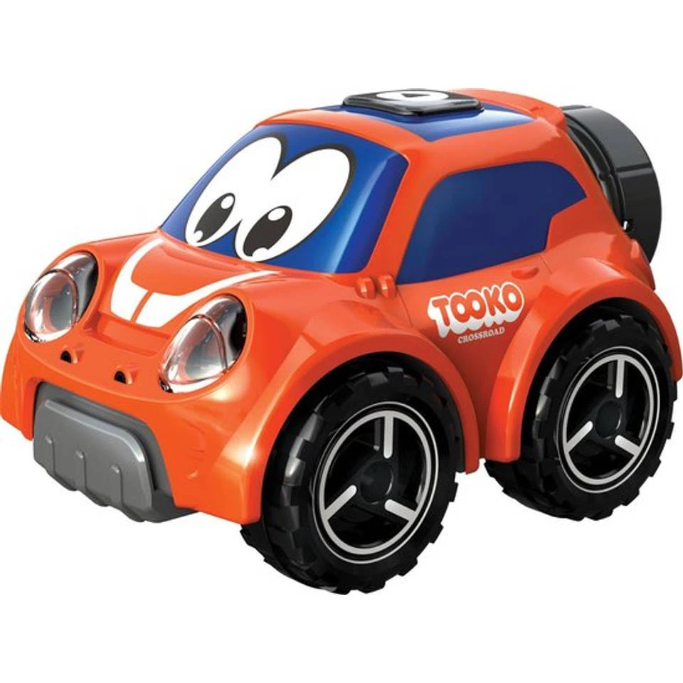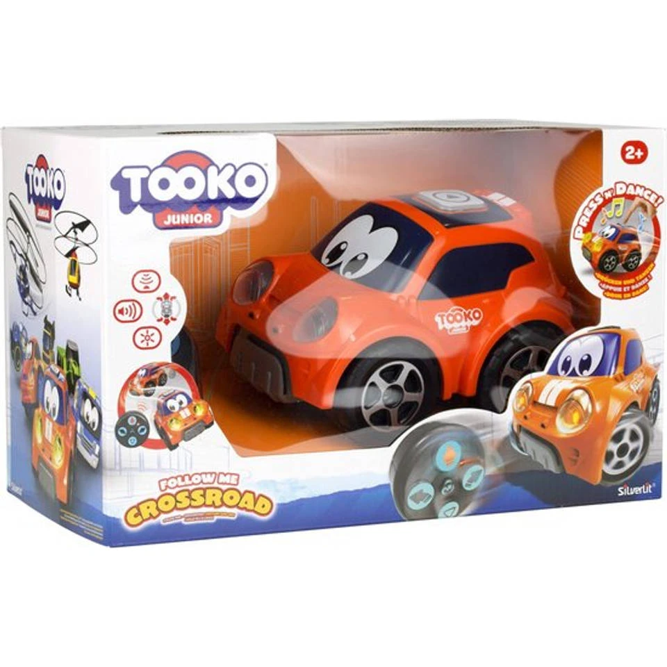 Deze levendige op afstand bestuurbare Follow Me Crossroad Junior auto is uit de Tooko Junior lijn van Silverlit! Deze stoere auto draagt zijn controller op de achterzijde. Stuur met de controller de Crossroad alle kanten op of druk op de ‘Volg mij’ knop, zodat de auto je volgt, waar je ook gaat. Tooko Follow Me Crossroad heeft grote ogen, knipperende koplampen en grappige sound-effecten. Crossroad kan ook dansen, druk op z’n dak en dansen maar. De Follow Me Crossroad is leerzaam en vooral heel erg leuk!