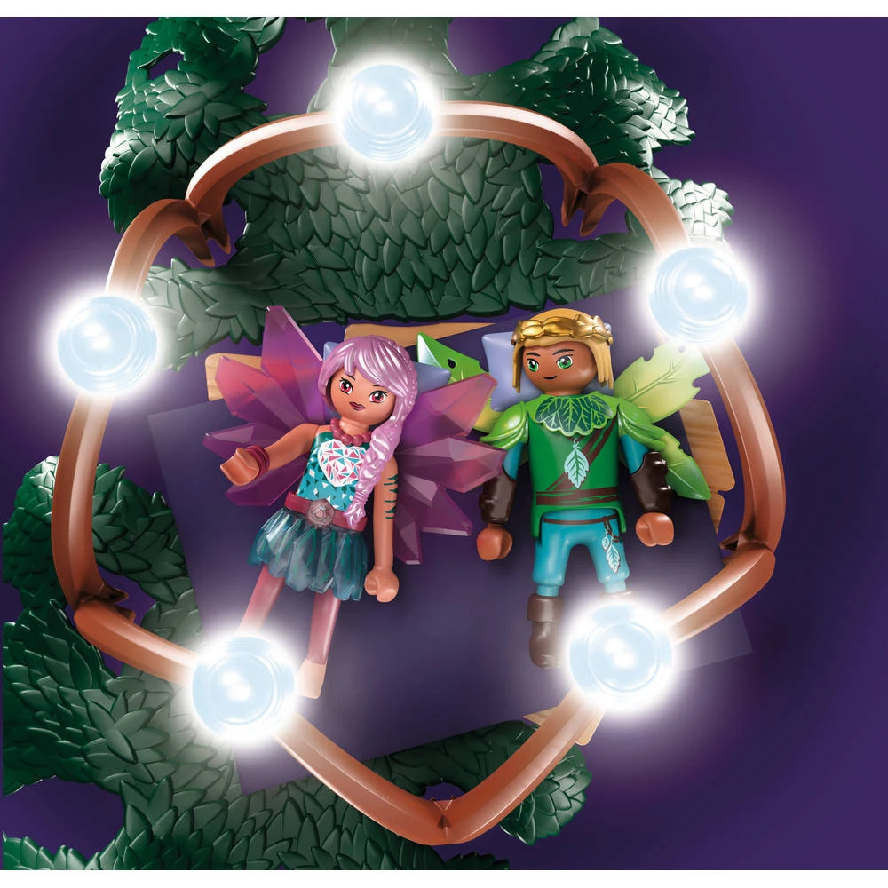 Waan je in het betoverde sprookjesbos en ontdek de mysterieuze Playmobil Adventures of Ayuma gemeenschappelijke boom. Het is niet alleen de woonplaats van de feeën, maar ook een veilig toevluchtsoord voor de magische wezens en hun vriendelijke totemdieren. Elke feeënsoort wordt met z’n symbool op de boom afgebeeld. De feeën ontmoeten elkaar voor vrolijke gesprekken in de gezellige gemeenschappelijke ruimte. Om de sterren te observeren gebruiken ze de telescoop van het observatorium. In de toren van de boom staat een sterrenprojector waarmee een romantische sterrenhemel op het plafond geprojecteerd kan worden. De trouwe totemdieren hebben een knusse beschutting onder de boomwortel. Hier is voldoende ruimte om te eten, te spelen en te rusten.