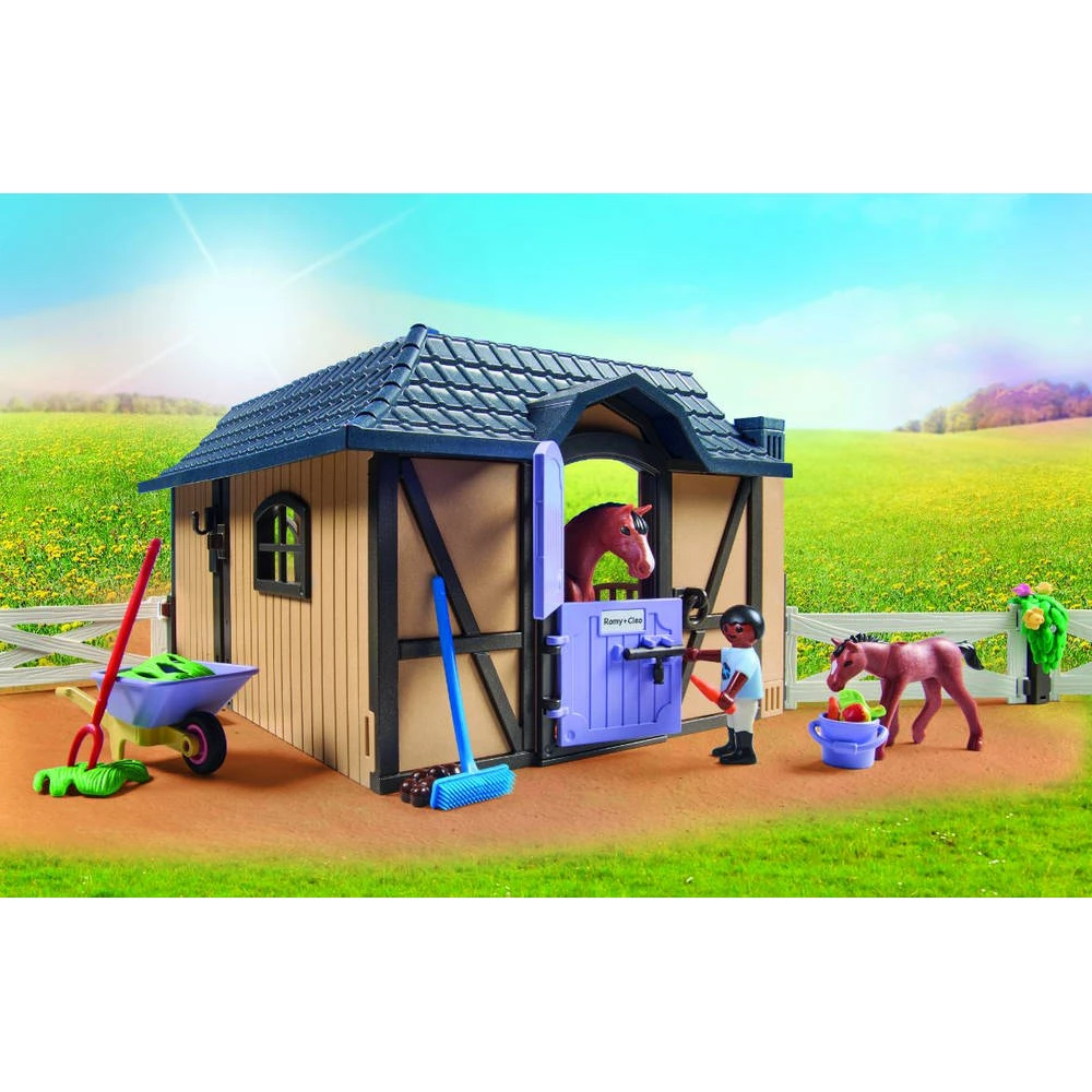 - De set bevat twee Playmobil-figuren, een manege met hek, een voerrek, een zadel, schoonmaakspullen, een kruiwagen en andere accessoires.