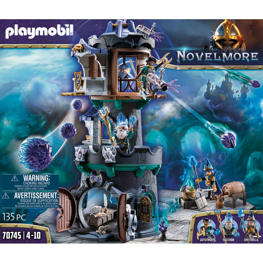 Met deze Playmobil Novelmore Violet Vale tovenaarstoren zal je de fantastische wereld van de machtige tovenaar Timithor ontdekken! Hij is de bewaker van de tijd. De magische werkplaats van Timithors vriend en metgezel Sagithor bevindt zich in de legendarische magische toren van Violet Vale. Hier worden toverspreuken beoefend en magische drankjes gebrouwen. De mystieke toren bevat veel geheimen en er is hier zelfs een waardevolle schat verstopt. Het is echter bijna onmogelijk om de sprankelende kristallen te plunderen, omdat het hek op de begane grond is afgesloten door een magisch slot dat alleen geopend kan worden door echte tovenaars. Vanuit de toren houdt tovenares Crysthella door de verrekijker een oogje in het zeil voor mogelijk gevaar. Mochten demonen of duistere tovenaars de toren naderen, dan worden ze begroet met projectielen uit het kanon.