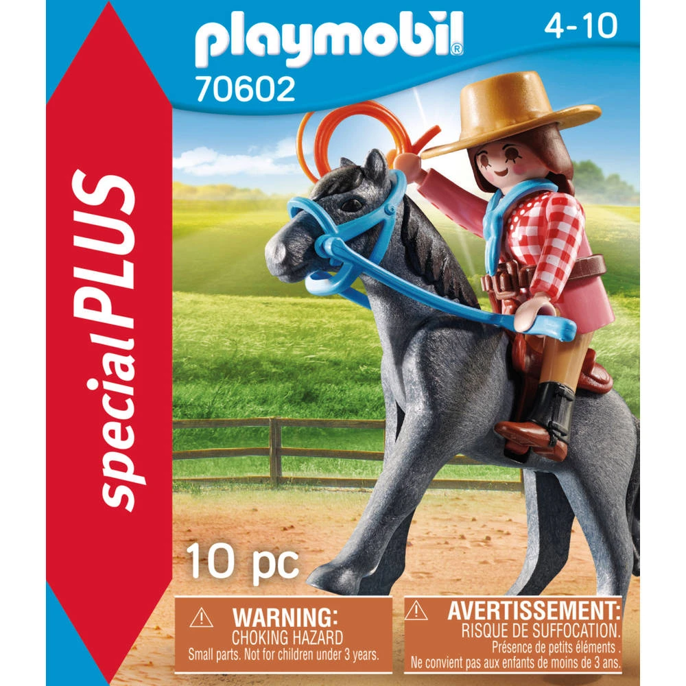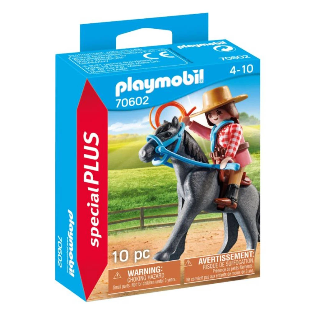 De Playmobil SpecialPLUS western ruiter is leuk voor Western fans! De rodeorijder oefent weer nieuwe, spannende trucs. Ze rijdt weg en gooit de lasso, lukt het deze keer? Playmobil SpecialPLUS figuren met accessoires zijn ideale souvenirs. Heel leuk om te verzamelen, mee te spelen of weg te geven!